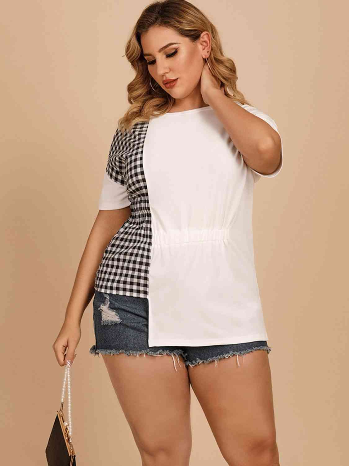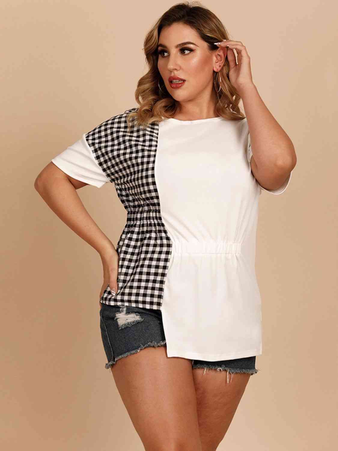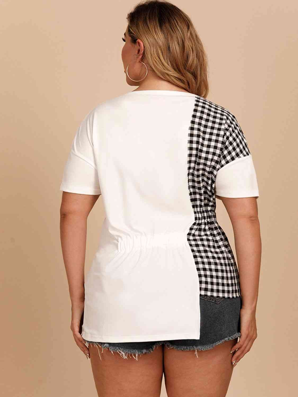 🌟 Plus Size Gingham Color Block Asymmetrical T-Shirt 🌟