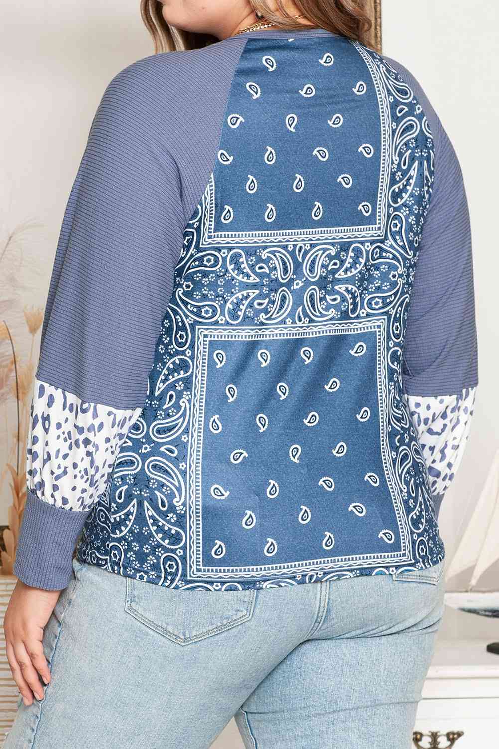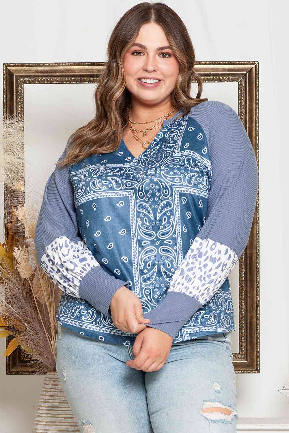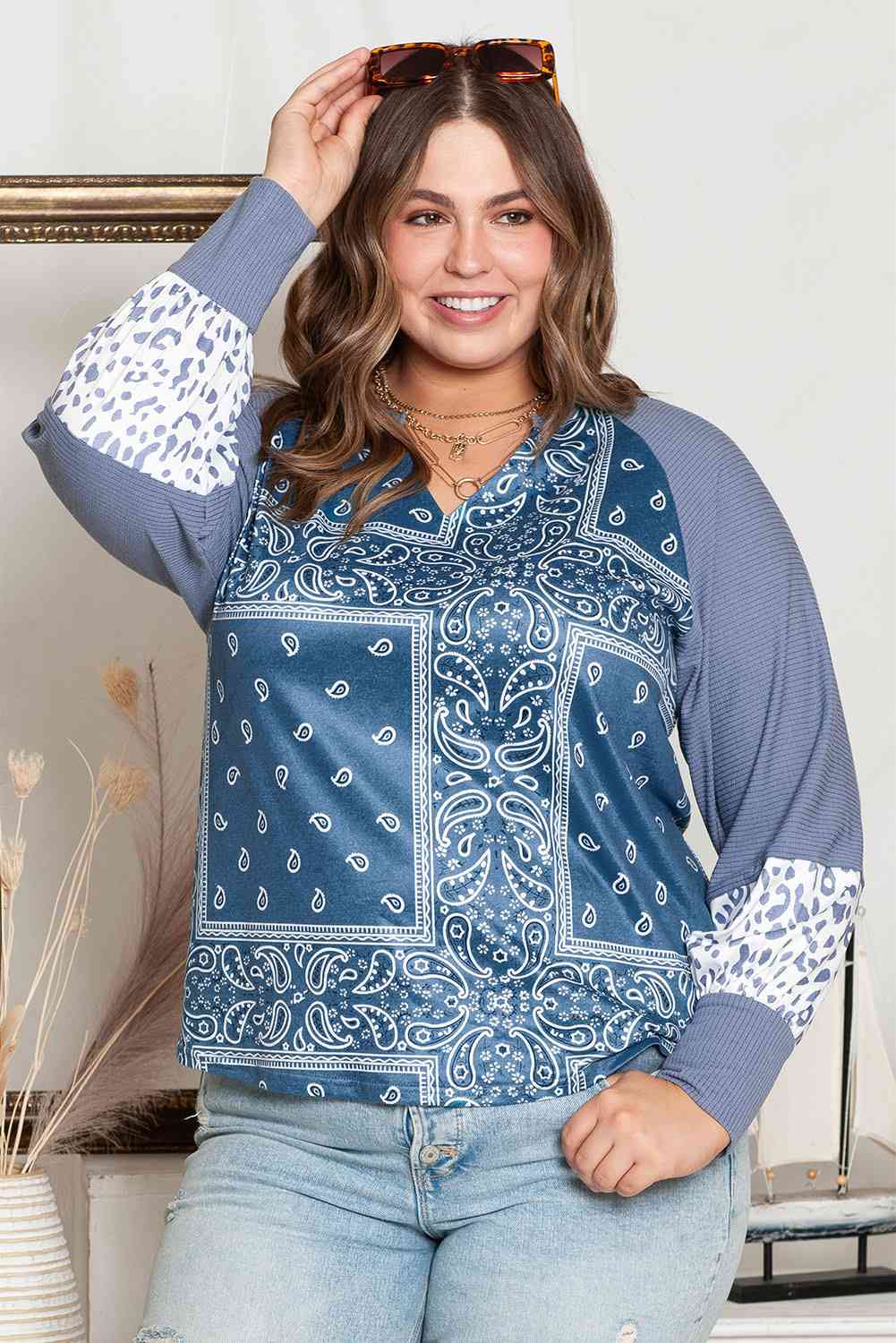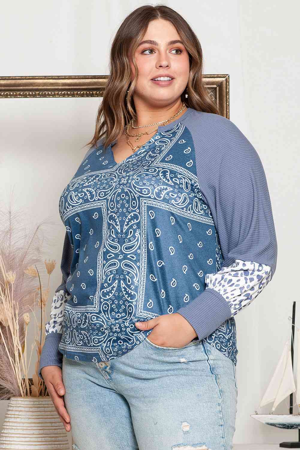 Plus Size V-Neck Printed Raglan Sleeve Blouse